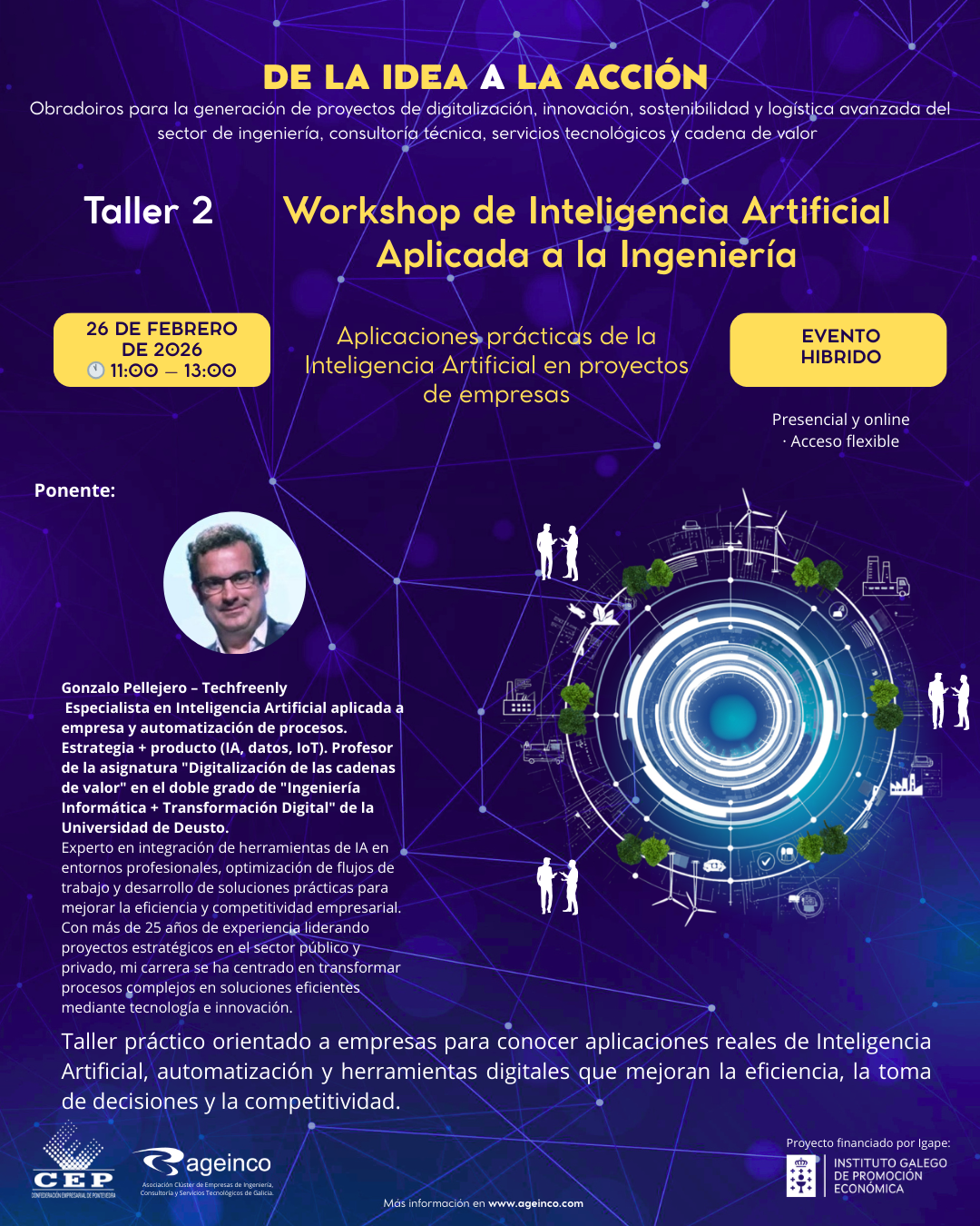 El taller contará con la participación de Gonzalo Pellejero, especialista en Inteligencia Artificial aplicada y automatización empresarial en Techfreenly, quien compartirá experiencias reales, herramientas y enfoques prácticos para integrar la IA en entornos profesionales de ingeniería y consultoría técnica.