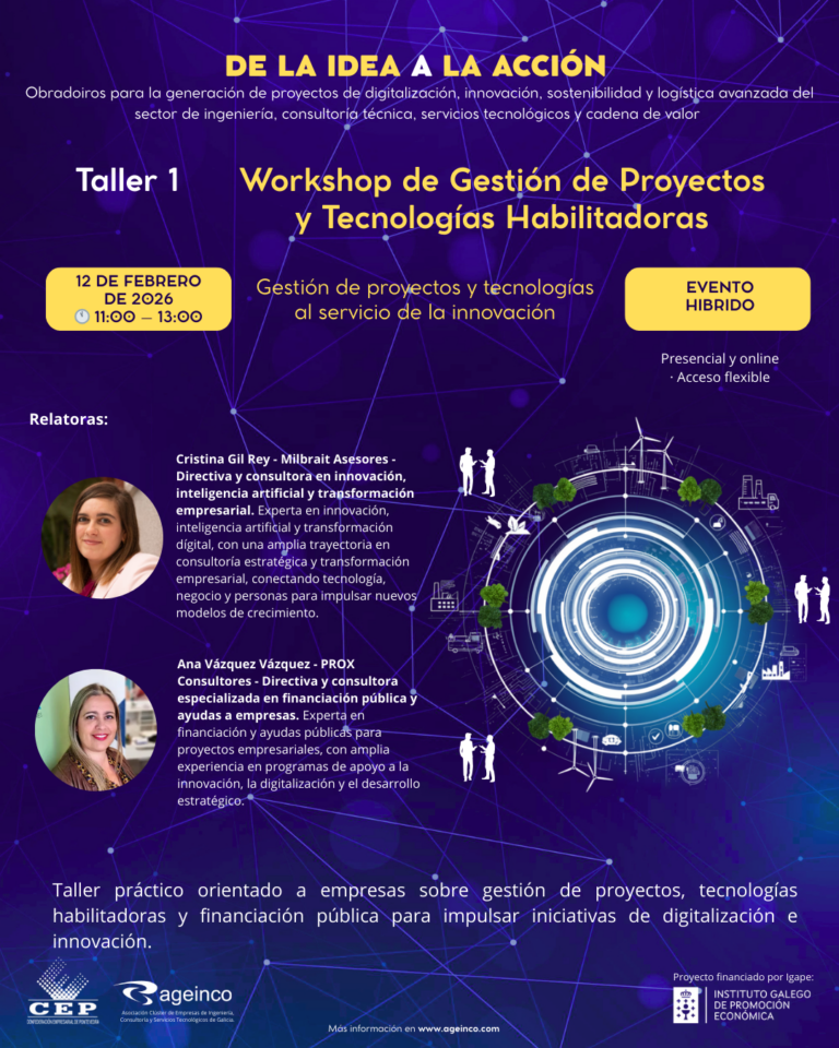 AGEINCO celebró el pasado 12 de febrero el Taller 1 – Workshop de Gestión de Proyectos y Tecnologías Habilitadoras, primera sesión del programa “De la idea a la acción”, una iniciativa orientada a impulsar la generación de proyectos de digitalización, innovación, sostenibilidad y logística avanzada en el sector de la ingeniería, la consultoría técnica y los servicios tecnológicos.